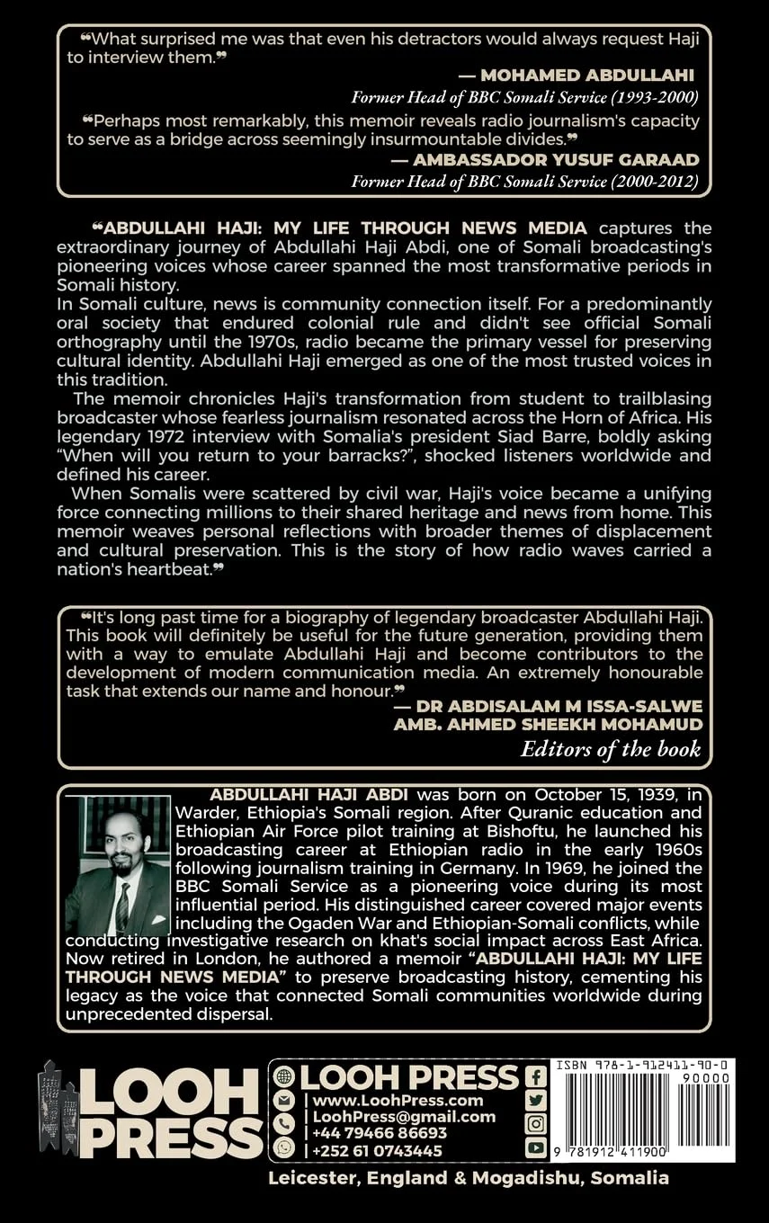 ABDULLAHI HAJI: MY LIFE THROUGH NEWS MEDIA captures the extraordinary journey of Abdullahi Haji Abdi, one of Somali broadcasting's pioneering voices whose career spanned the most transformative periods in Somali history.