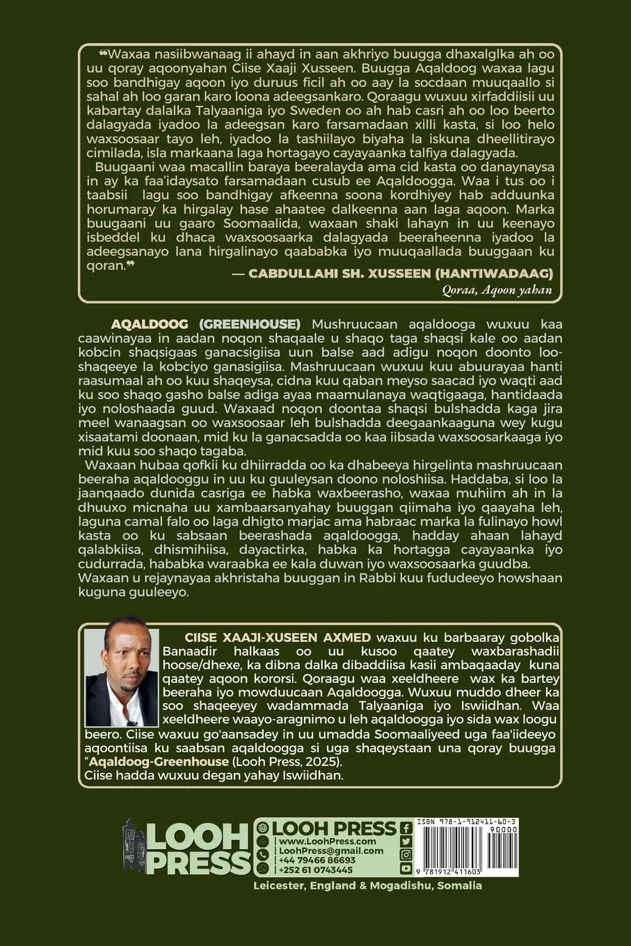 CIISE XAAJI-XUSEEN AXMED waxuu ku barbaaray gobolka Banaadir halkaas oo uu kusoo qaatey waxbarashadii hoose/dhexe, ka dibna dalka dibaddiisa kasii ambaqaaday kuna qaatey aqoon kororsi. Qoraagu waa xeeldheere wax ka bartey beeraha iyo mowduucaan Aqaldoogga. Wuxuu muddo dheer ka soo shaqeeyey wadammada Talyaaniga iyo Iswiidhan. Waa xeeldheere waayo-aragnimo u leh aqaldoogga iyo sida wax loogu beero. Ciise waxuu go'aansadey in uu umadda Soomaaliyeed uga faa'iideeyo aqoontiisa ku saabsan aqaldoogga si uga shaqeystaan una qoray buugga "Aqaldoog-Greenhouse (Looh Press, 2025). Ciise hadda wuxuu degan yahay Iswiidhan.