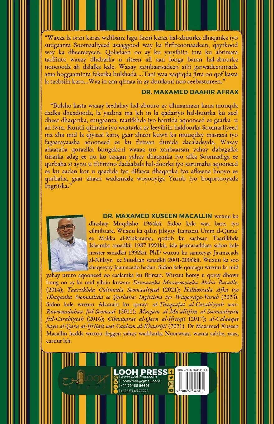 Bulsho kasta waxay leedahay hal-abuuro ay tilmaamaan kana muuqda dadka dhexdooda, la yaabna ma leh in la qadariyo hal-buurka ku xeel dheer dhaqanka, suugaanta, taariikhda iyo hantida aqooneed ee gaarka u ah iwm. Runtii qiimaha iyo waxtarka ay leeyihiin haldoorka Soomaaliyeed ma aha mid la qiyaasi karo, gaar ahaan kuwii ka muuqday masraxa iyo fagaarayaasha aqooneed ee ku firirsan dunida dacaladeyda. Waxay ahaataba qoraalka buugakani waxaa uu xanbaarsan yahay dabagalka tiirarka adag ee uu ku taagan yahay dhaqanka iyo afka Soomaaliga ee qurbaha si aynu u iftiimino dadaalada hal-doorka iyo xarumaha aqooneed ee ku aadan kor u qaadida iyo difaaca dhaqanka iyo afkeena hooyo ee qurbaha, gaar ahaan wadamada woyooyiga Yurub iyo boqortooyada Ingriiska.