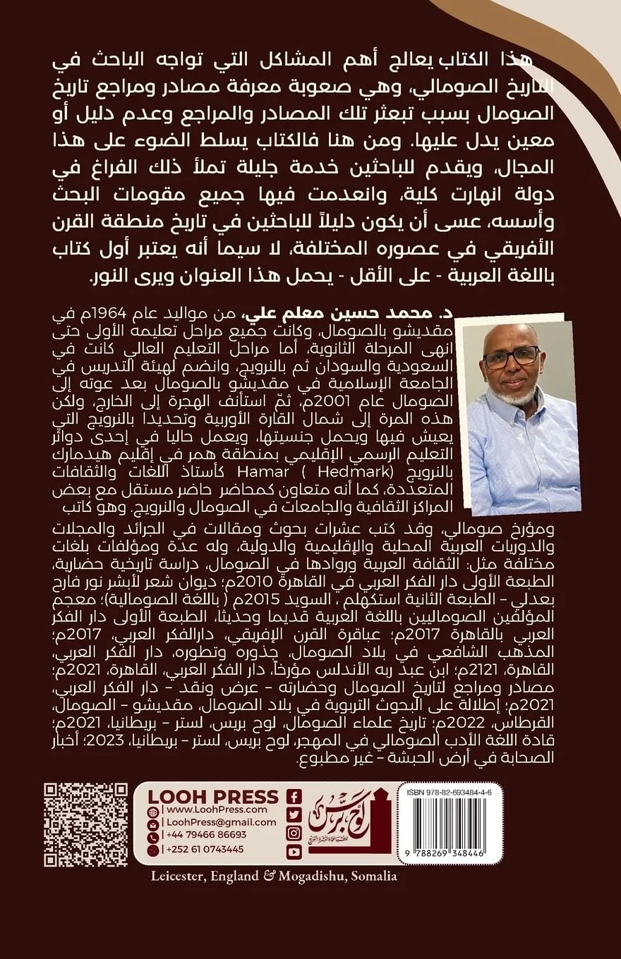 Maṣādir Tārīkh al-Ṣomāl wa Marājiʿahu. ʿAraḍ wa Naqad: This book tackles the most important issues faced by researchers of Somali history, which is the difficulty of knowing the sources and references of Somali history due to the scattering of those sources and references and the lack of a guide or helper to point to them. Hence, the book sheds light on this area and provides researchers with a great service that fills this gap in a country that has completely collapsed and in which all the fundamentals and foundations of research have been lost, hoping it would be a guide for researchers of the history of the Horn of Africa region in its different eras, especially since it is considered the first book in Arabic - at least - to have this title and see the light.
