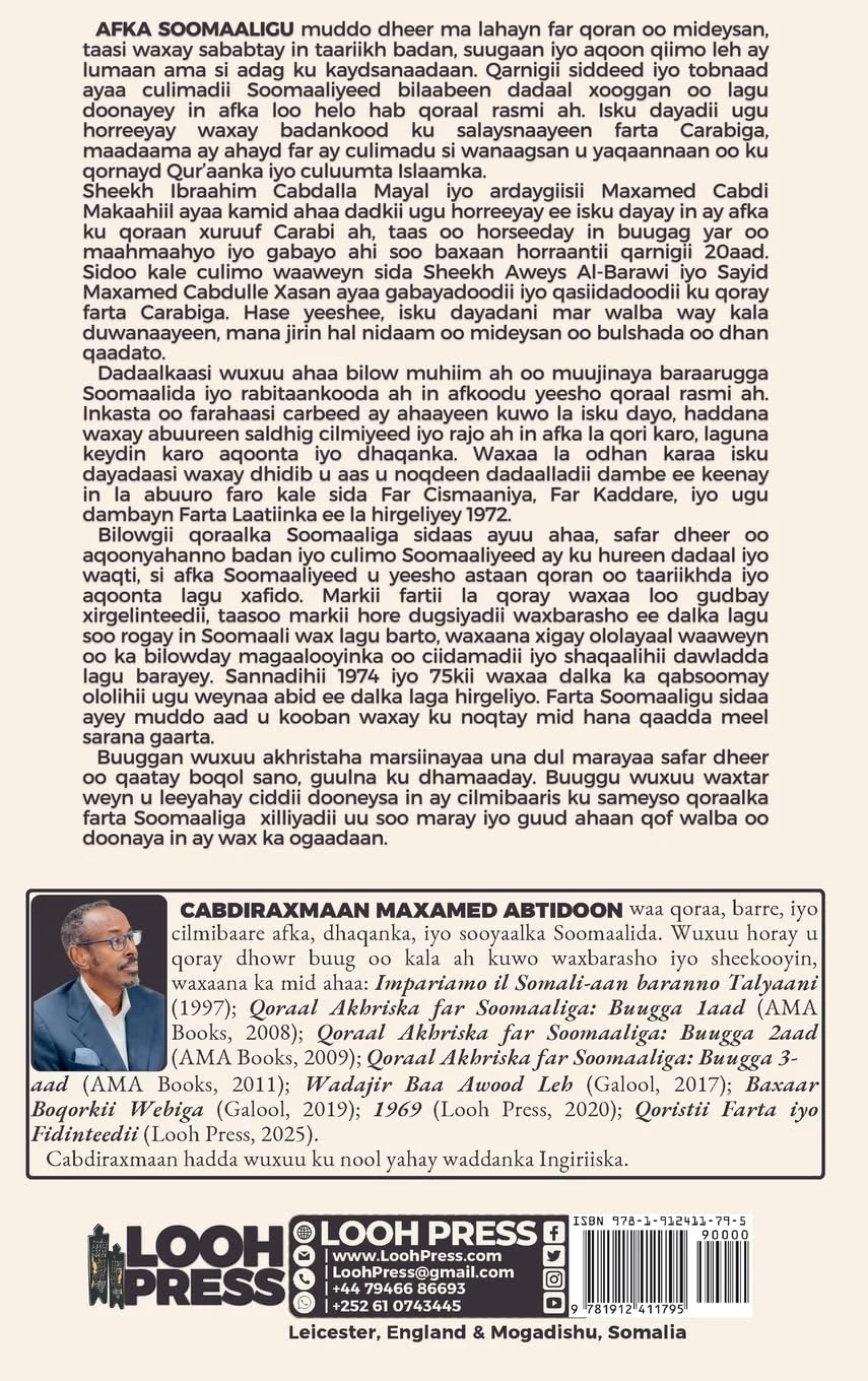 Buuggan wuxuu akhristaha marsiinayaa una dul marayaa safar dheer oo qaatay boqol sano, guulna ku dhamaaday. Buuggu wuxuu waxtar weyn u leeyahay ciddii dooneysa in ay cilmibaaris ku sameyso qoraalka farta Soomaaliga xilliyadii uu soo maray iyo guud ahaan qof walba oo doonaya in ay wax ka ogaadaan.
