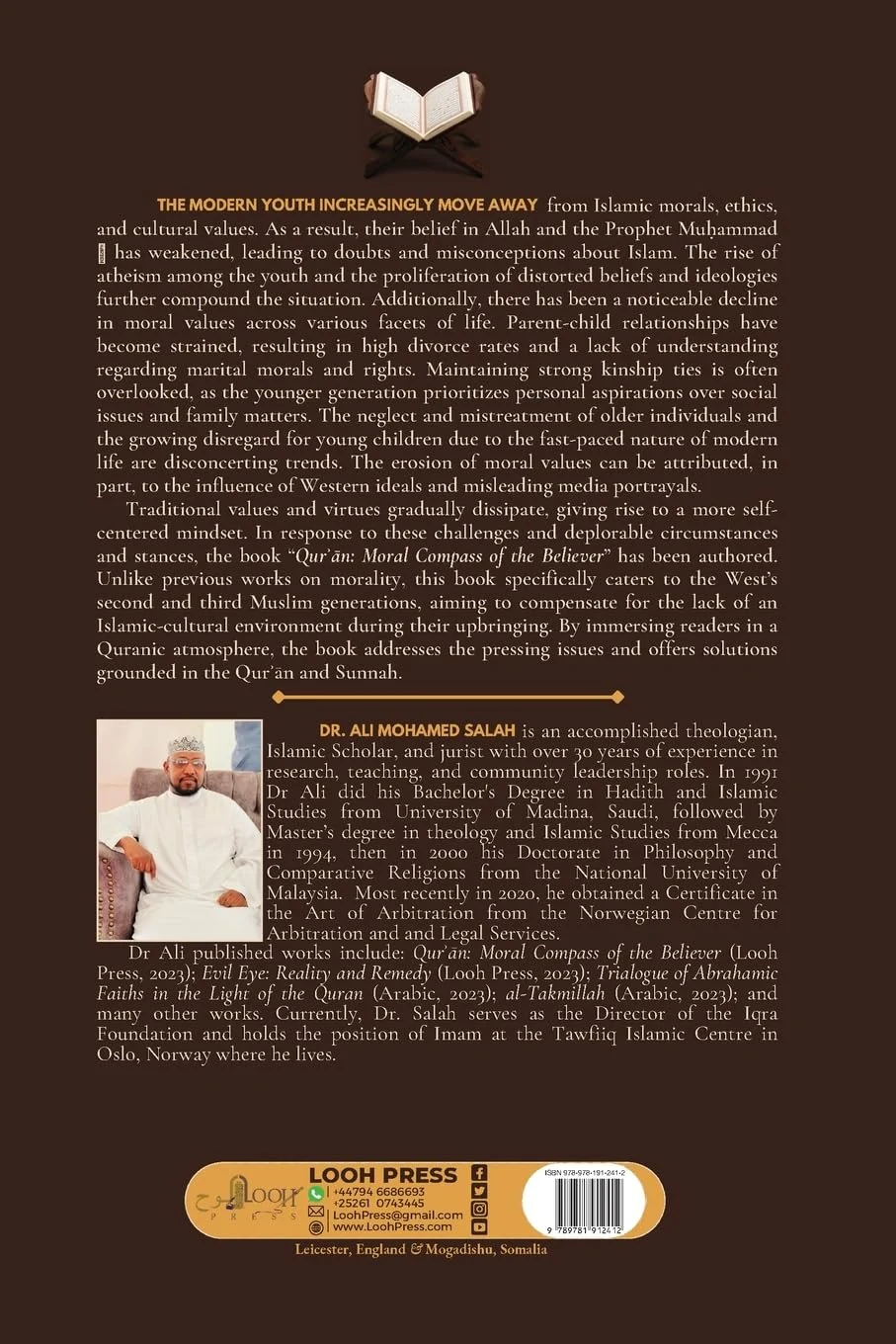 THE MODERN YOUTH INCREASINGLY move away from Islamic morals, ethics, and cultural values. As a result, their belief in Allah and the Prophet Muḥammad ﷺ has weakened, leading to doubts and misconceptions about Islam. The rise of atheism among the youth and the proliferation of distorted beliefs and ideologies further compound the situation. Additionally, there has been a noticeable decline in moral values across various facets of life. Parent-child relationships have become strained, resulting in high divorce rates and a lack of understanding regarding marital morals and rights. Maintaining strong kinship ties is often overlooked, as the younger generation prioritizes personal aspirations over social issues and family matters. The neglect and mistreatment of older individuals and the growing disregard for young children due to the fast-paced nature of modern life are disconcerting trends. The erosion of moral values can be attributed, in part, to the influence of Western ideals and misleading media portrayals. Traditional values and virtues gradually dissipate, giving rise to a more self-centered mindset. In response to these challenges and deplorable circumstances and stances, the book “Qurʾān: Moral Compass of the Believer” has been authored. Unlike previous works on morality, this book specifically caters to the West’s second and third Muslim generations, aiming to compensate for the lack of an Islamic-cultural environment during their upbringing. By immersing readers in a Quranic atmosphere, the book addresses the pressing issues and offers solutions grounded in the Qurʾān and Sunnah.ABOUT THE AUTHOR: DR ALI MOHAMED SALAH is an accomplished theologian, Islamic Scholar, and jurist with over 30 years of experience in research, teaching, and community leadership roles. In 1991 Dr Ali did his Bachelor’s Degree in Hadith and Islamic Studies from University of Madina, Saudi, followed by Master’s degree in theology and Islamic Studies from Mecca in 1994, then in 2000 his Doctorate in Philosophy and Comparative Religions from the National University of Malaysia. Most recently in 2020, he obtained a Certificate in the Art of Arbitration from the Norwegian Centre for Arbitration and and Legal Services. Dr Ali published works include: Qurʾān: Moral Compass of the Believer (Looh Press, 2023); Evil Eye: Reality and Remedy (Looh Press, 2023); Trialogue of Abrahamic Faiths in the Light of the Quran (Arabic, 2023); al-Takmillah (Arabic, 2023); and many other works. Currently, Dr. Salah serves as the Director of the Iqra Foundation and holds the position of Imam at the Tawfiiq Islamic Centre in Oslo, Norway where he lives.