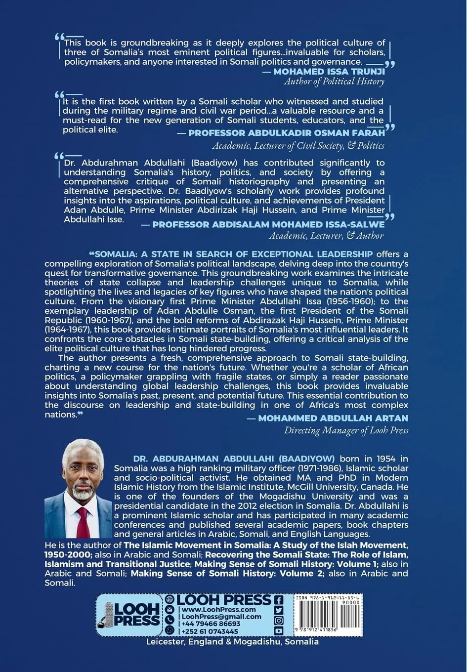 ❝SOMALIA: A STATE IN SEARCH OF EXCEPTIONAL LEADERSHIP offers a compelling exploration of Somalia’s political landscape, delving deep into the country’s quest for transformative governance. This groundbreaking work examines the intricate theories of state collapse and leadership challenges unique to Somalia, while spotlighting the lives and legacies of key figures who have shaped the nation’s political culture. From the visionary first Prime Minister Abdullahi Issa (1956-1960); to the exemplary leadership of Adan Abdulle Osman, the first President of the Somali Republic (1960-1967), and the bold reforms of Abdirazak Haji Hussein, Prime Minister (1964-1967), this book provides intimate portraits of Somalia’s most influential leaders. It confronts the core obstacles in Somali state-building, offering a critical analysis of the elite political culture that has long hindered progress. The author presents a fresh, comprehensive approach to Somali state-building, charting a new course for the nation’s future. Whether you’re a scholar of African politics, a policymaker grappling with fragile states, or simply a reader passionate about understanding global leadership challenges, this book provides invaluable insights into Somalia’s past, present, and potential future. This essential contribution to the discourse on leadership and state-building in one of Africa’s most complex nations.❞