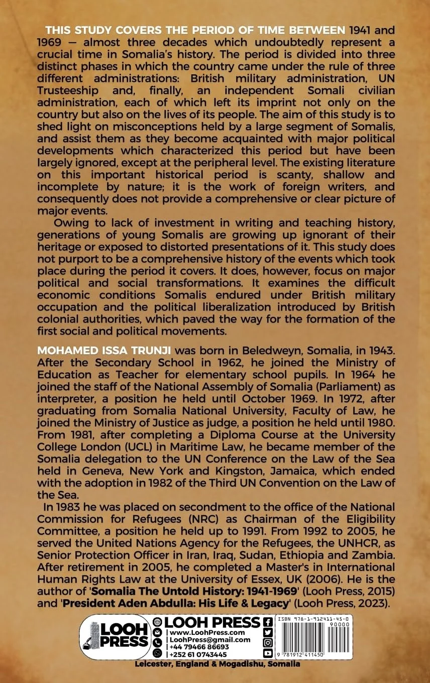 Owing to lack of investment in writing and teaching history, generations of young Somalis are growing up ignorant of their heritage or exposed to distorted presentations of it. This study does not purport to be a comprehensive history of the events which took place during the period it covers. It does, however, focus on major political and social transformations. It examines the difficult economic conditions Somalis endured under British military occupation and the political liberalization introduced by British colonial authorities, which paved the way for the formation of the first social and political movements.